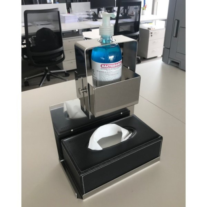 Soporte sobremesa DM-8928 acero inoxidable con portadosificador de gel y bandeja. 27x20x15cm