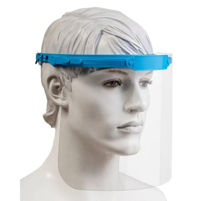 Visera de protección basculante para atención al cliente. Sistema basculante que permite subir y bajar la visera con comodidad. Para personas con contacto frecuente directo con otras personas. Ideal para personas que trabajan en centros de salud y atención al público en general. Con tiras de goma y sistema dentado ajustable para adaptarse al contorno de la cabeza. Material PETG de 500 micras. Peso 120g. Forma curva para proteger el frontal y los laterales de la cara. Dimensiones: 30x21cm Reutilizable. Fácil de limpiar con spray desinfectante. Color azul. Espacio frontal para personalizar.