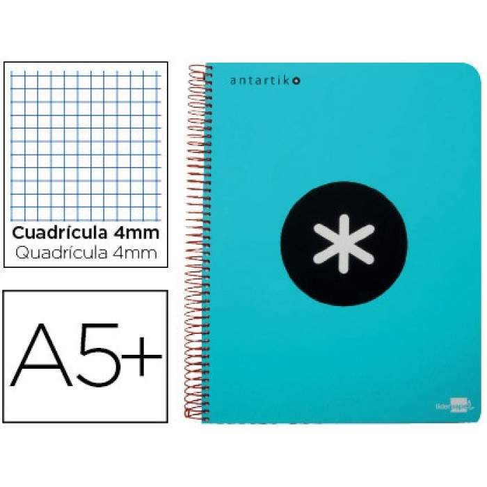 Cuaderno ANTARTIK espiral A5 tapa azul turquesa 100gr. 80h cuadrícula 4mm con margen