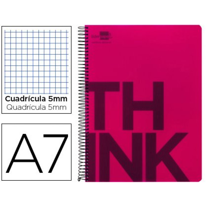 Cuaderno espiral liderpapel a7 micro think tapa plastico 100h 70g cuadro 5mm 4 bandas rosa. Tapa de polipropileno transparente ondulado de 800 micras. Diseño impresoen cartulina de 180 g/m². Papel de 80 g/m². Espiral nylonizada negra. Conmargen. Coil-lock.