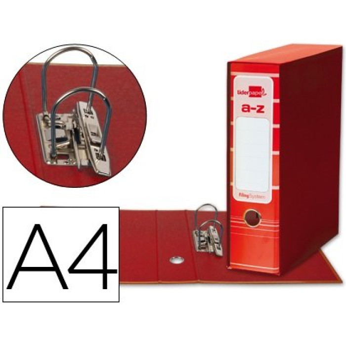 Archivador de palanca liderpapel a4 filing system forrado sin rado lomo 80mm rojocon caja y compresor metalico. Archivador fabricado en cartón forrado de 1,9 mm de espesor, plastificado con caja. Mecanismo de palanca de 75 mm con ollao y compresor metálico. Ancho de lomo: 80 mm. Formato din a4. Medidas: 318 x 285 mm.