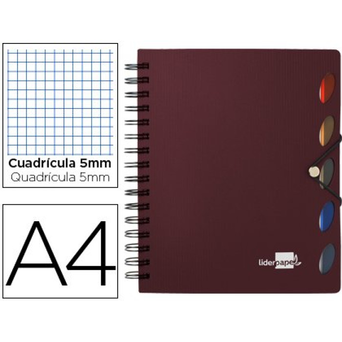 Bloc espiral LIDERPAPEL A4 cuadricula 5mm micro ex 100 hojas 80gr. c/ separadores Burdeos