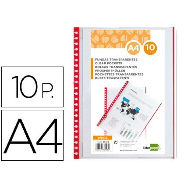 Recambio funda liderpapel intercambiables din a4 bolsa de 10 unidades. Fabricadas en polipropileno. Formato din a4. Portada de 700 micras de grosor. Con 20 fundas extraíbles de 70 micras de grosor.