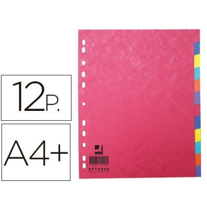 Separador q-connect cartulina brillo juego de 12 separadores din a4+. Juego de separadores fabricado en cartulina brillo de color de 225 g/m². Disposición en escalera para agilizar la consulta e identificación de documentos. Multitaladro para archivar en diferentes mecanismos de anillas. Colores vivos opacos. En formatos din a4 y a4+.
