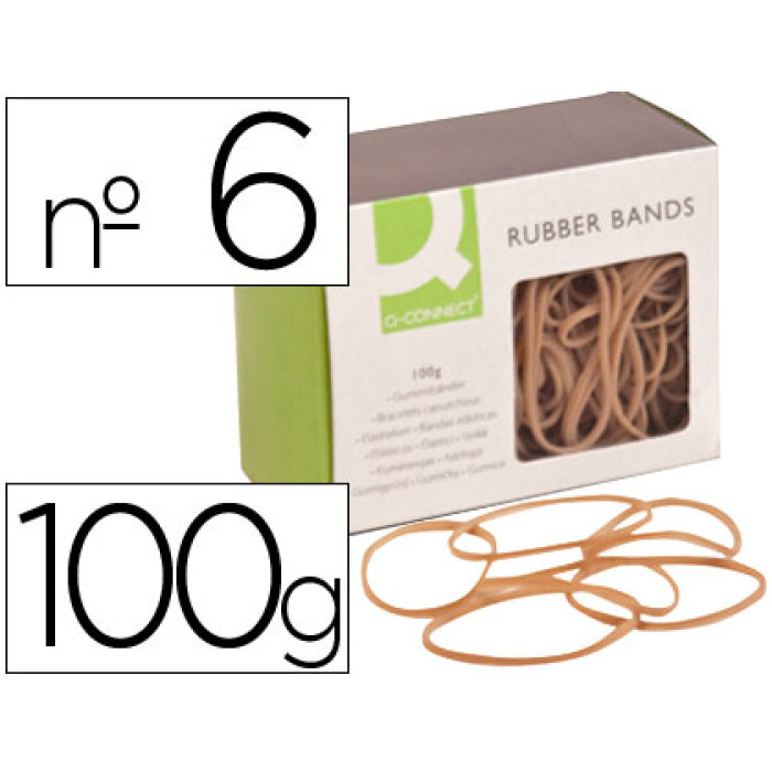 Gomillas elasticas q-connect 100 gr numero 6 60 x 2 mm. 80 % caucho de alta calidad y resistencia. Ancho de 2 mm. Su presentación en caja facilita su conservación y almacenamiento.