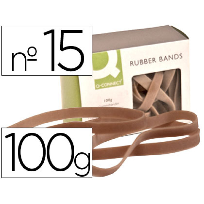 Bandas elasticas q-connect 100 gr 150x9 mm numero 15. 80 % caucho de alta calidad y resistencia. Su presentación en caja facilita su conservación y almacenamiento.