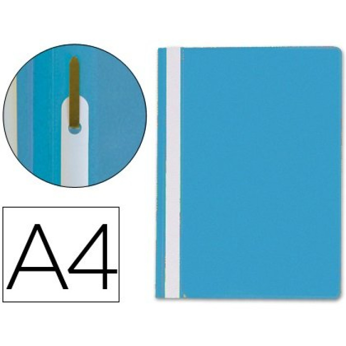 Carpeta dossier fastener plástico Q-CONNECT DIN A4 azul. Fabricada en pvc, con fástener metálico, cubierta transparente y trasera opaca. Ventana con tira de papel en el lomo para personalizar el trabajo. Formato din a4. Tapa de 110 micras. Contratapa de 180 micras.