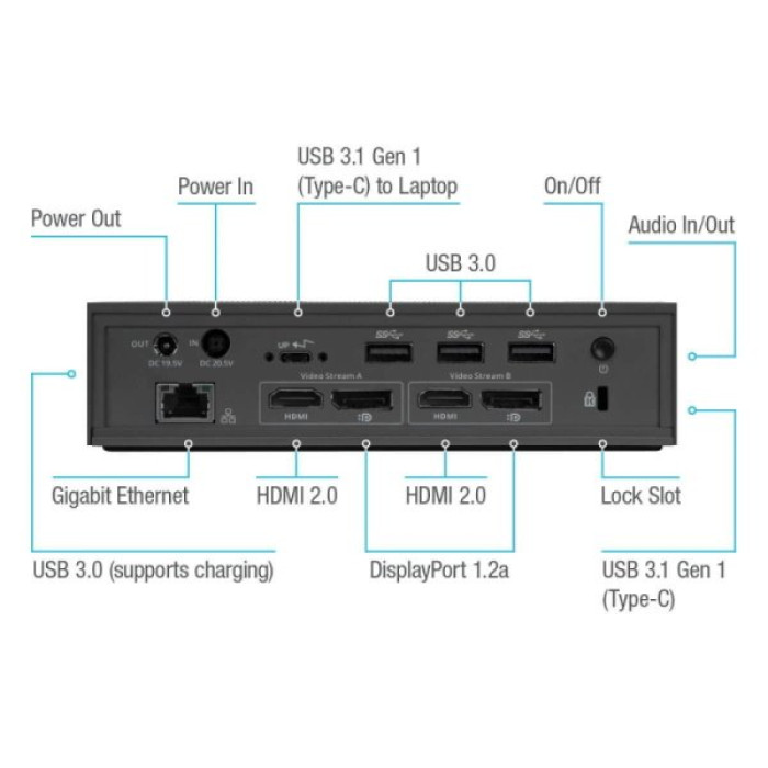 Docking Station universal con conexión USB-C™ y vídeo dual 4K de 100 W de potencia CARACTERÍSTICAS Amplíe o duplique la pantalla de su portátil con hasta dos monitores Ultra HD 4K para obtener espacios de trabajo productivos y de alto rendimiento Conexión sin complicaciones, compatible universalmente con dispositivos USB-A y USB-C, incluidos dispositivos Thunderbolt™ 3 Suministro de energía universal integrado de hasta 100 W para dispositivos USB-C, ADEMÁS DE capacidad de carga universal para dispositivos antiguos USB-A, que incluye tomas de alimentación para ASUS®, Dell™, HP® y Lenovo™ Garantía de 3 años de Targus, incluyendo soporte técnico y tranquilidad en la calidad de nuestros accesorios. Soporta Windows 10, Mac O/S Compatible con Thunderbolt™ 3 Soporta video de monitor doble 4K Ultra HD a través de 2x DisplayPort™ (DP 1.2a) y 2x HDMI (HDMI 2.0) puertos, DisplayLink™ Tecnología de chip DL 6950. USB-C Entrega de energía hasta 100W, USB-A Incluye puntas de energía para Acer®, ASUS®, Compaq®, Dell™, Fujitsu®, Gateway®, HP®, IBM/Lenovo™, y Toshiba 1 USB-C™ Puerto para dispositivos USB 3.1 Gen 1 1 puerto Gigabit Ethernet 4 puertos USB 3.0 para los últimos periféricos (1 de carga rápida) 1 entrada/salida de audio combinada de 3,5 mm para micrófonos, altavoces y auriculares Incluye 1 metro de USB-C™ a un cable anfitrión de tipo A (desmontable) y 1 ranura de bloqueo estándar