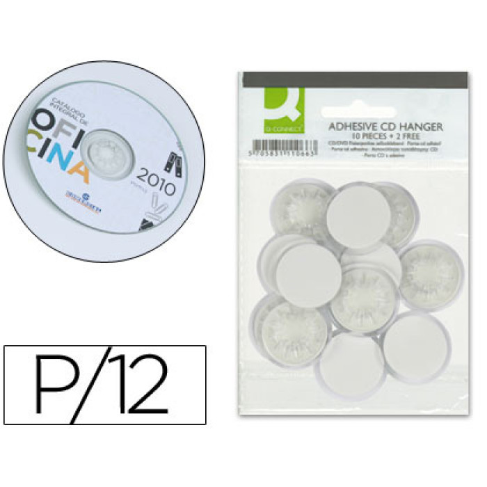 Soporte para cd q-connect adhesivos -bolsa de 12 unidades. Soporte adhesivo para cd/dvd. Muy útil para archivar información en soporte digital y conservarlo junto con la documentación en papel. El soporte adhesivo se fija fácilmente a papel, plástico, cartulina, etc. Diámetro: 30 mm. Bolsa de 12 unidades (10+2 gratis).