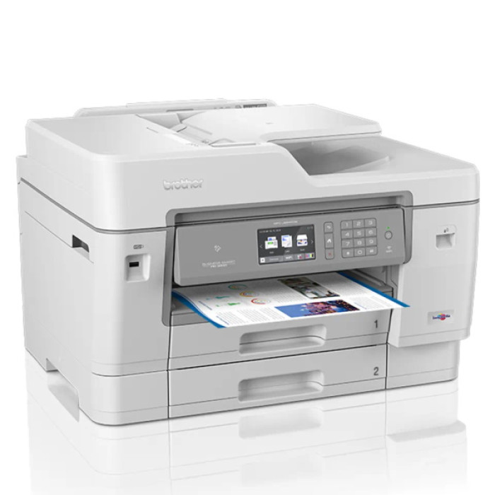 Impresora multifunción de tinta A4/A3 profesional WiFi. Doble cara automática A3 en todas las funciones, alta capacidad de papel y cartuchos XL opcionales de alta duración para reducir el coste por página. Multifuncional 4en1: impresora/copiadora/escáner/fax. Impresora inyección de tinta a color. 4 cartuchos de tinta independientes. Pantalla color táctil de 9,3cm. Tamaño máximo de papel A3. Conexión a puerto USB 2.0, Ethernet 10/100Base-TX, inalámbrica IEEE 802.11b/g/n. Velocidad de impresión A4: 22ppm negro y 20ppm en color. Velocidad de impresión A4 a doble cara: 11ppm negro y 10ppm en color. Impresión automática a dobe cara (Duplex automático). Resolución de impresión: hasta 4800x1200ppp Escaner plano y alimentador ADF de originales duplex, resolución hasta 1200x2400ppp, velocidad 18ppm. 2 bandejas de entrada de papel de 250h, válidas para tamaño hasta A3. Bandeja multipropósito auxiliar de 100h, válidas para tamaño hasta A3. Consumibles: Baja capacidad: LC-3237BK / LC-3237C / LC-3237M / LC-3237Y. Alta capacidad: LC-3239BK / LC-3239C / LC-3239M / LC-3239Y. Color blanco. Dimensiones: 575x477x379mm Peso: 24,2Kg Garantía estándar 2 años. Brother ofrece 1 año adicional de garantía siempre que registre el equipo en la web.