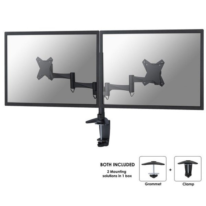 Brazo articulado NEWSTAR 2 monitores 3 puntos giro 10"-27" (15-360-180) grommet + clamp, negro