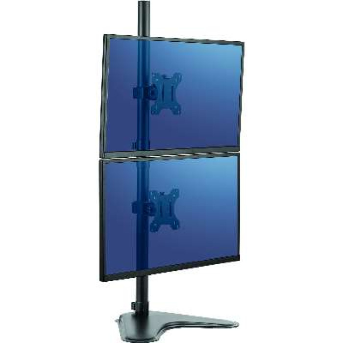 Peana para monitor doble Professional Series Color negro. Formato vertical. Los 2 monitores uno encima del otro. Los monitores dobles aumentan la productividad en el trabajo, ya que se puede trabajar con varias pantallas abiertas a la vez. • Ayuda a reducir la tensión en cuello, hombros y ojos • Sujeción mediante peana, idóneo para escritorios que no admitan fijación de pinza. • Admite monitores de hasta 30” y 16 kg en total. • Completamente ajustable para un ajuste óptimo del ángulo de visión. • Sistema de gestión de cables para un espacio de trabajo completamente despejado. • Especificaciones: +/- 45° Inclinación +/- 90° Oscilación, 360° Rotación • Cumple con el estándar VESA 75 x 75 y 100x100