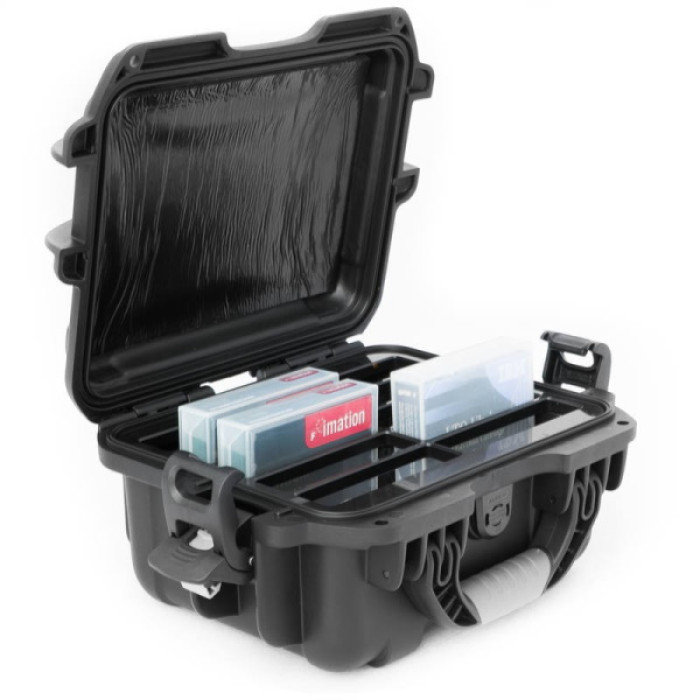 Maletín de transporte de cartuchos de datos LTO, 3592, 9840, T10000 con su estuche individual. Capacidad para 10 cartuchos en ranuras de plástico separadas. Hermético - cierre estanco para evitar la contaminación de polvo. Sellado para protección impermeable (Waterproof) con certificación ATA. Amortiguación superior. Cierres de acero inoxidable. 2 asas abatible de doble movimiento para prevenir apertura accidental. 2 ranuras para candados de seguridad. Maletín color negro. Dimensiones externas: largo 318mm x ancho 257mm x alto 152mm. Dimensiones internas: largo 239mm x ancho 188mm x alto 140mm. Peso: 2,0 Kg. 2 años de garantía.